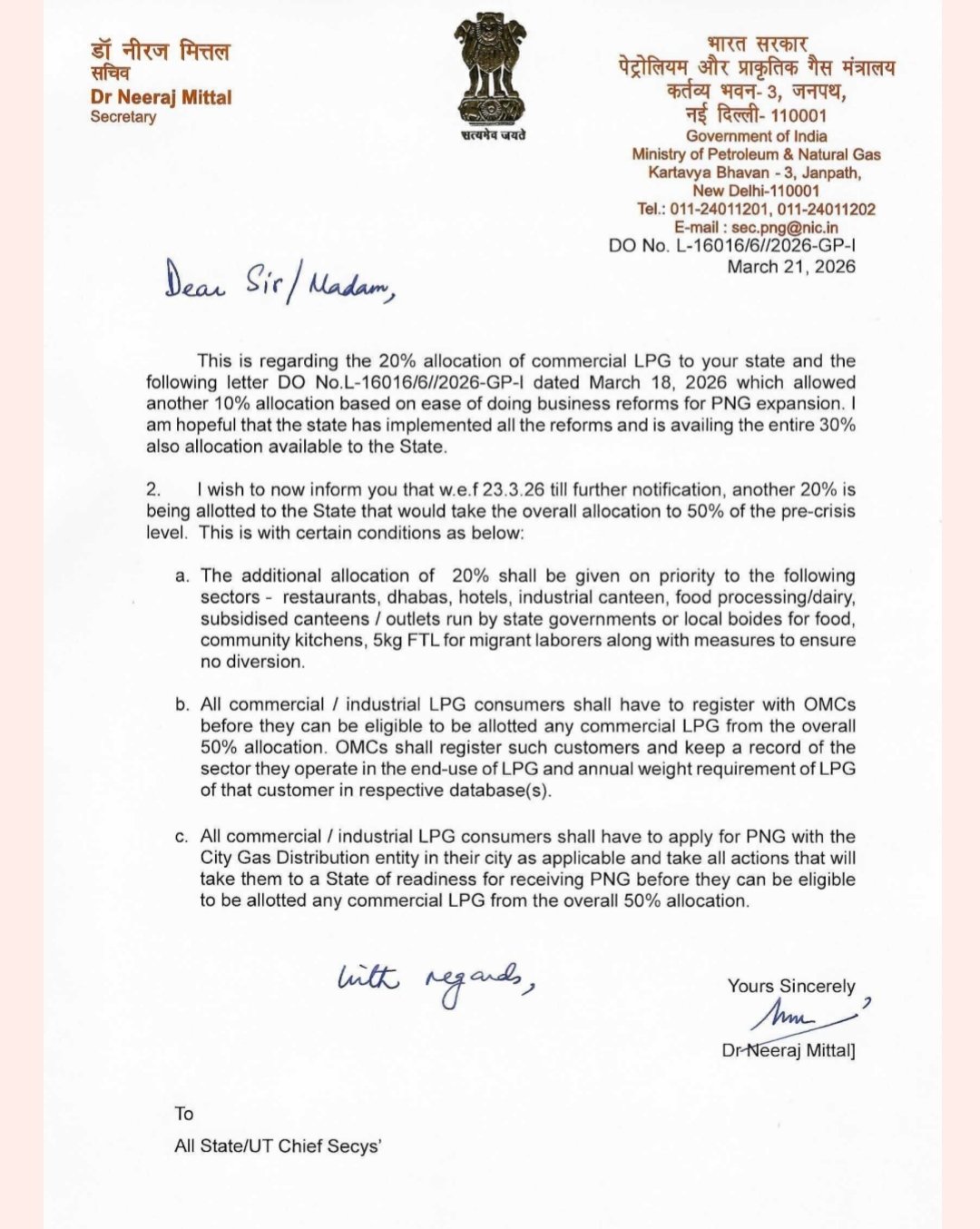 नई दिल्ली, 21 मार्च 2026: केंद्र सरकार के पेट्रोलियम और प्राकृतिक गैस मंत्रालय ने राज्यों को कमर्शियल एलपीजी (LPG) की सप्लाई को लेकर बड़ा फैसला लिया है। मंत्रालय के सचिव डॉ. नीरज मित्तल द्वारा जारी पत्र के अनुसार अब राज्यों को कमर्शियल LPG का कुल आवंटन बढ़ाकर 50% तक किया जाएगा, जिससे होटल, रेस्तरां और उद्योगों को बड़ी राहत मिलने की उम्मीद है।
