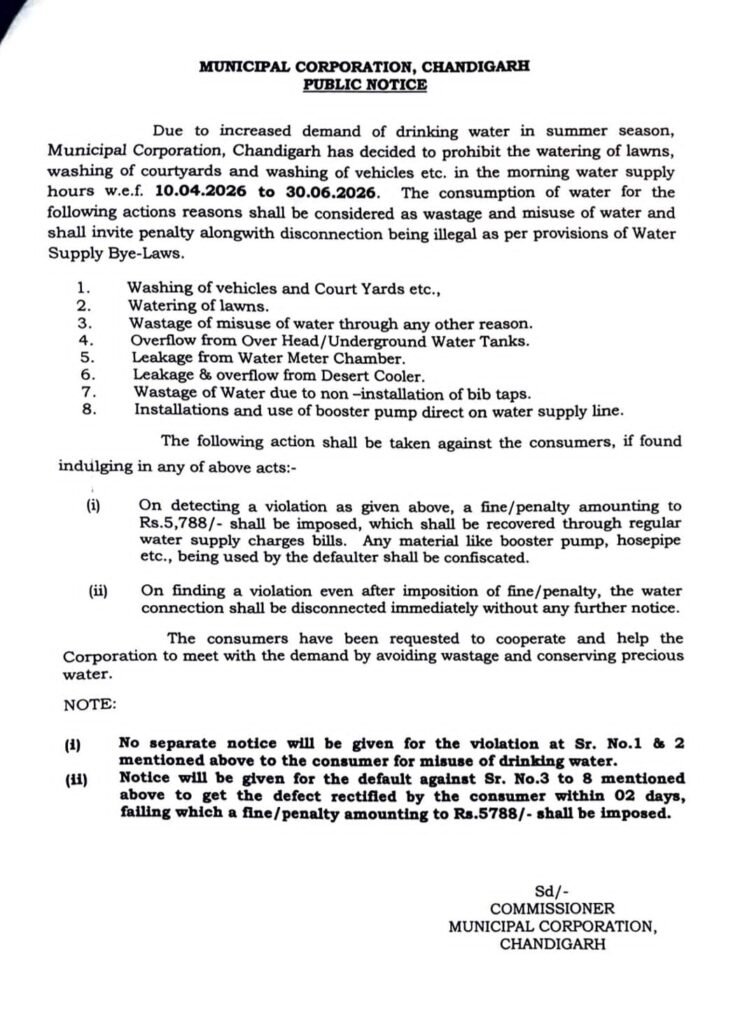 चंडीगढ़, 8 अप्रैल: Municipal Corporation Chandigarh ने गर्मियों में बढ़ती पानी की मांग को देखते हुए बड़ा फैसला लिया है। निगम ने 10 अप्रैल 2026 से 30 जून 2026 तक सुबह के पानी सप्लाई समय के दौरान पानी की बर्बादी पर रोक लगाने के लिए पब्लिक नोटिस जारी किया है।