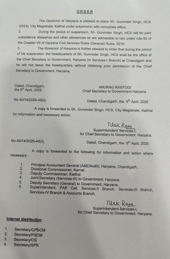 चंडीगढ़, 6 अप्रैल 2026: हरियाणा सरकार ने बड़ा प्रशासनिक फैसला लेते हुए कैथल के सिटी मजिस्ट्रेट गुरविंदर सिंह (HCS) को तत्काल प्रभाव से सस्पेंड कर दिया है। इस संबंध में आदेश जारी करते हुए मुख्य सचिव अनुराग रस्तोगी ने निलंबन की पुष्टि की है।