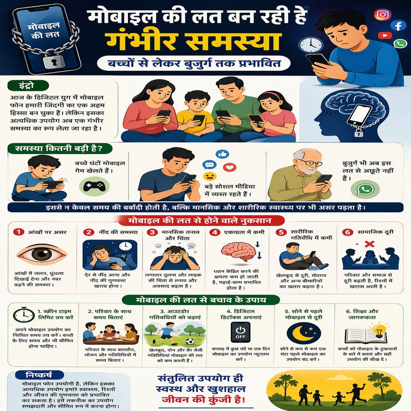 आज के डिजिटल युग में मोबाइल फोन हमारी जिंदगी का एक अभिन्न हिस्सा बन चुका है। सुबह आंख खुलने से लेकर रात सोने तक मोबाइल का उपयोग लगभग हर व्यक्ति किसी न किसी रूप में करता है। बैंकिंग, पढ़ाई, मनोरंजन, सोशल मीडिया और कामकाज—हर चीज मोबाइल पर निर्भर होती जा रही है। लेकिन जिस तकनीक ने जीवन को आसान बनाया है, वही अब अत्यधिक उपयोग के कारण एक गंभीर समस्या का रूप लेती जा रही है। विशेषज्ञों का मानना है कि मोबाइल की लत अब केवल आदत नहीं रही, बल्कि यह एक व्यवहारिक और मानसिक समस्या बनती जा रही है, जो बच्चों से लेकर बुजुर्गों तक को प्रभावित कर रही है।