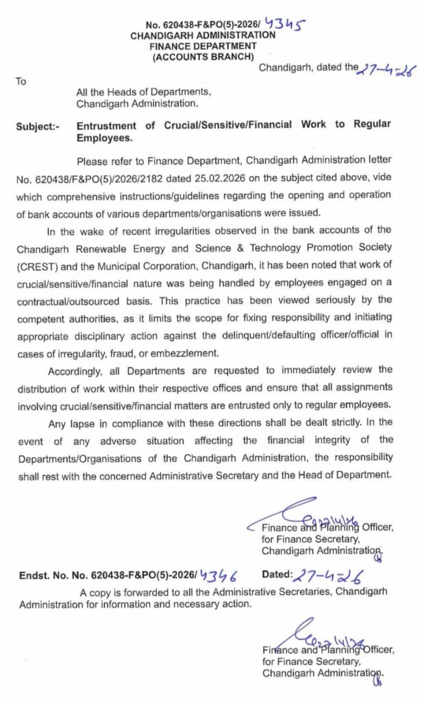 चंडीगढ़ प्रशासन के वित्त विभाग (अकाउंट्स ब्रांच) ने सभी विभागों को निर्देश जारी करते हुए कहा है कि अब किसी भी प्रकार के महत्वपूर्ण, संवेदनशील और वित्तीय कार्य केवल नियमित (रेगुलर) कर्मचारियों को ही सौंपे जाएं।