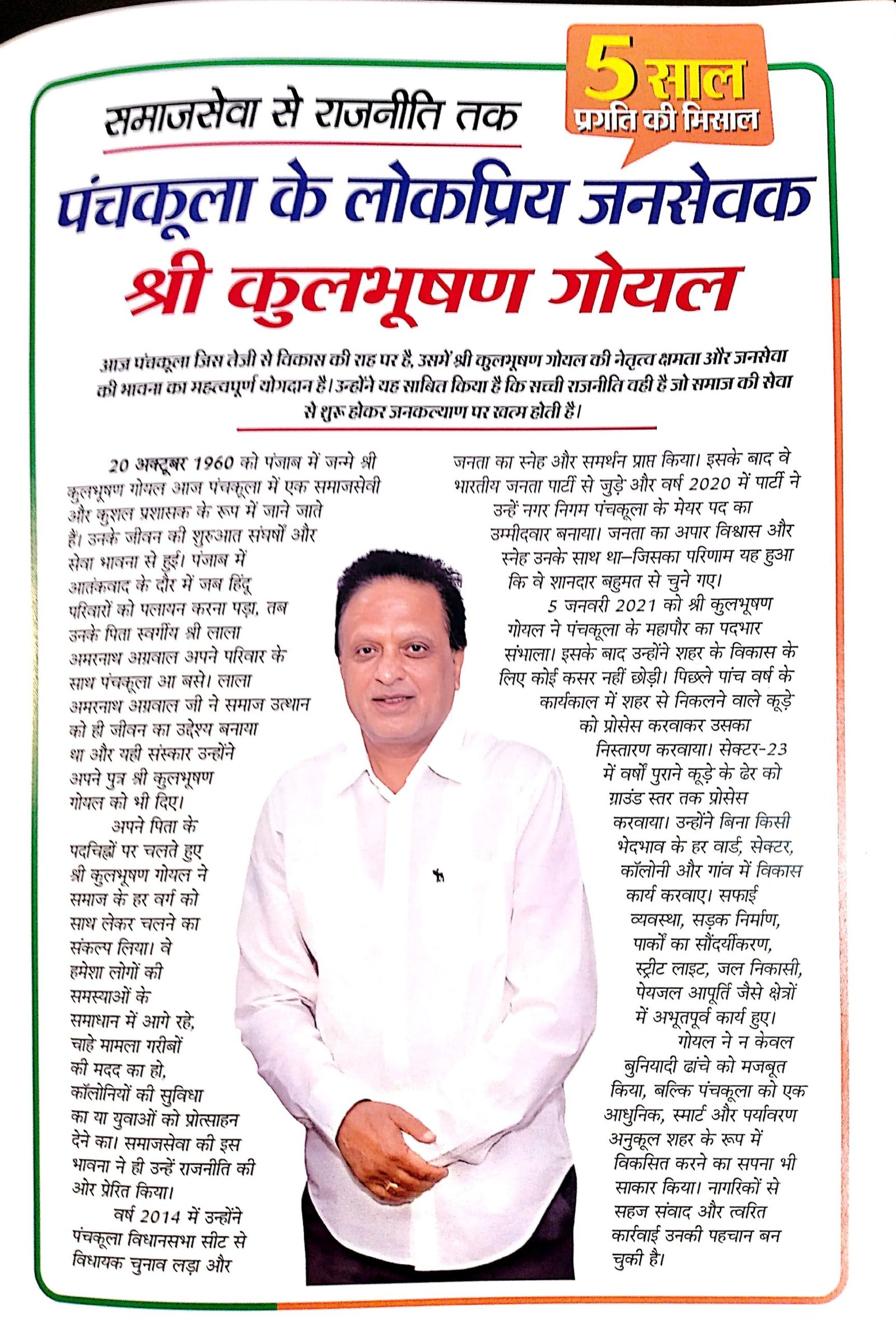 पंचकूला: नगर निगम पंचकूला के निवर्तमान मेयर कुलभूषण गोयल का पांच वर्षीय कार्यकाल न केवल शहर के विकास के लिए याद किया जाएगा, बल्कि इस कार्यकाल ने यह भी साबित कर दिया कि राजनीति का मूल उद्देश्य जनसेवा और समाज कल्याण होना चाहिए। आज पंचकूला जिस तेजी से स्मार्ट और आधुनिक शहर बन रहा है, उसमें गोयल की दूरदर्शी सोच और मजबूत नेतृत्व की स्पष्ट छाप है।