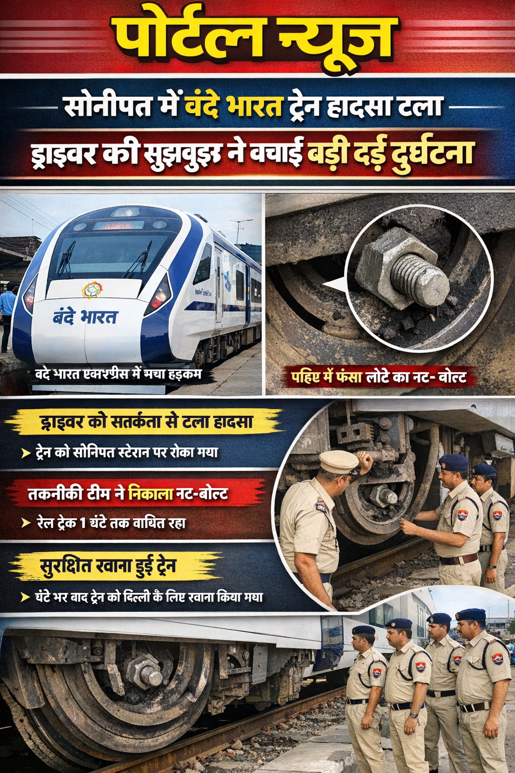 सोनीपत: हरियाणा के सोनीपत में एक बड़ा रेल हादसा होते-होते टल गया। अमृतसर से पुरानी दिल्ली जा रही वंदे भारत एक्सप्रेस के इंजन के पहिये में अचानक लोहे का नट-बोल्ट फंस गया, जिससे तेज आवाज होने लगी।