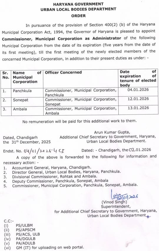 शहरी स्थानीय निकाय विभाग द्वारा 2 जनवरी 2026 को जारी आदेश में सोनीपत नगर निगम सदन का कार्यकाल 12 जनवरी 2026 तक दर्शाया गया है, जबकि कानूनन यह कार्यकाल 6 जनवरी 2026 को ही समाप्त हो चुका था।