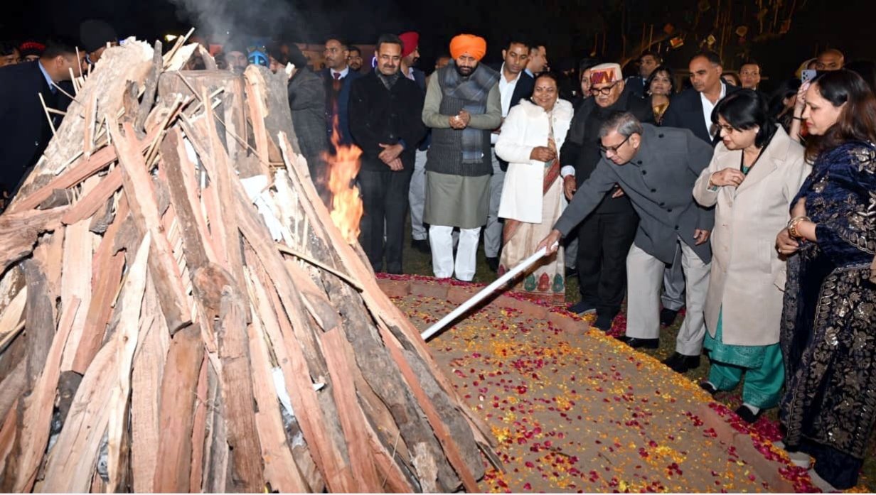 पंजाब के राज्यपाल गुलाब चंद कटारिया, हरियाणा के राज्यपाल असीम कुमार घोष, हरियाणा के मुख्यमंत्री नायब सिंह सैनी और पंजाब के मुख्यमंत्री भगवंत मान पंजाब लोक भवन, चंडीगढ़ में लोहड़ी के पर्व पर सामूहिक चित्र में।