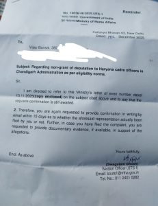 चंडीगढ़/पंचकूला, 15 जनवरी 2026: चंडीगढ़ यूटी प्रशासन में हरियाणा कैडर के आईएएस और एचसीएस अधिकारियों को उनकी योग्यता, वरिष्ठता और कैडर नियमों के अनुरूप बराबर की नियुक्तियां न दिए जाने का मुद्दा अब गंभीर रूप ले चुका है। शिवालिक विकास मंच के प्रदेश अध्यक्ष एवं वरिष्ठ कांग्रेस नेता विजय बंसल एडवोकेट ने इस संबंध में केंद्रीय गृह मंत्री अमित शाह को विस्तृत ज्ञापन के साथ दस्तावेजी साक्ष्य भेजे हैं।
