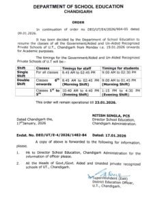 चंडीगढ़: चंडीगढ़ शिक्षा विभाग ने ठंड को ध्यान में रखते हुए स्कूलों को लेकर अहम आदेश जारी किया है। विभाग के अनुसार शहर के सभी सरकारी, सहायता प्राप्त और मान्यता प्राप्त निजी स्कूलों में 19 जनवरी 2026 से कक्षाएं दोबारा शुरू की जाएंगी। विद्यार्थियों की सुरक्षा को देखते हुए स्कूलों को सिंगल और डबल शिफ्ट में संचालित करने के निर्देश दिए गए हैं।