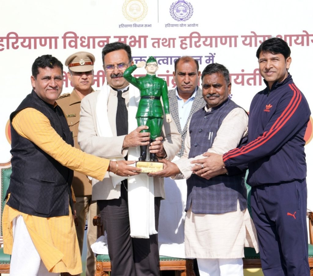 हरियाणा विधान सभा अध्यक्ष हरविन्द्र कल्याण को नेताजी सुभाष चंद्र बोस की जयंती के उपलक्ष्य में हरियाणा विधान सभा, चंडीगढ़ में आयोजित राज्य स्तरीय सूर्य नमस्कार कार्यक्रम के दौरान स्मृति चिन्ह भेंट करते हुए हरियाणा योग आयोग के चेयरमैन डॉ. जयदीप आर्य व उपाध्यक्ष डॉ. रोशन
