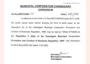 चंडीगढ़, 28 जनवरी 2026: चंडीगढ़ नगर निगम ने मेयर और डिप्टी मेयर के चुनाव की प्रक्रिया में महत्वपूर्ण बदलाव किया है। नगर निगम सचिवालय ने बुधवार को जारी Corrigendum (No.Secy/MCC/2026/58) के माध्यम से बताया कि 29 जनवरी को अब चुनाव में गोपनीय मतपत्र (Secret Ballot) की जगह “हाथ उठाकर मतदान (Show of Hands)” की प्रक्रिया अपनाई जाएगी।