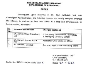 चंडीगढ़: चंडीगढ़ प्रशासन ने आईएएस अधिकारी हरि कल्लिकट के प्रशासन से कार्यमुक्त होने के बाद प्रशासनिक कामकाज को सुचारू बनाए रखने के उद्देश्य से अधिकारियों को अतिरिक्त प्रभार सौंपे हैं। कार्मिक विभाग द्वारा जारी आदेशों के तहत यह जिम्मेदारियां अस्थायी व्यवस्था के रूप में अगले आदेशों तक दी गई हैं।