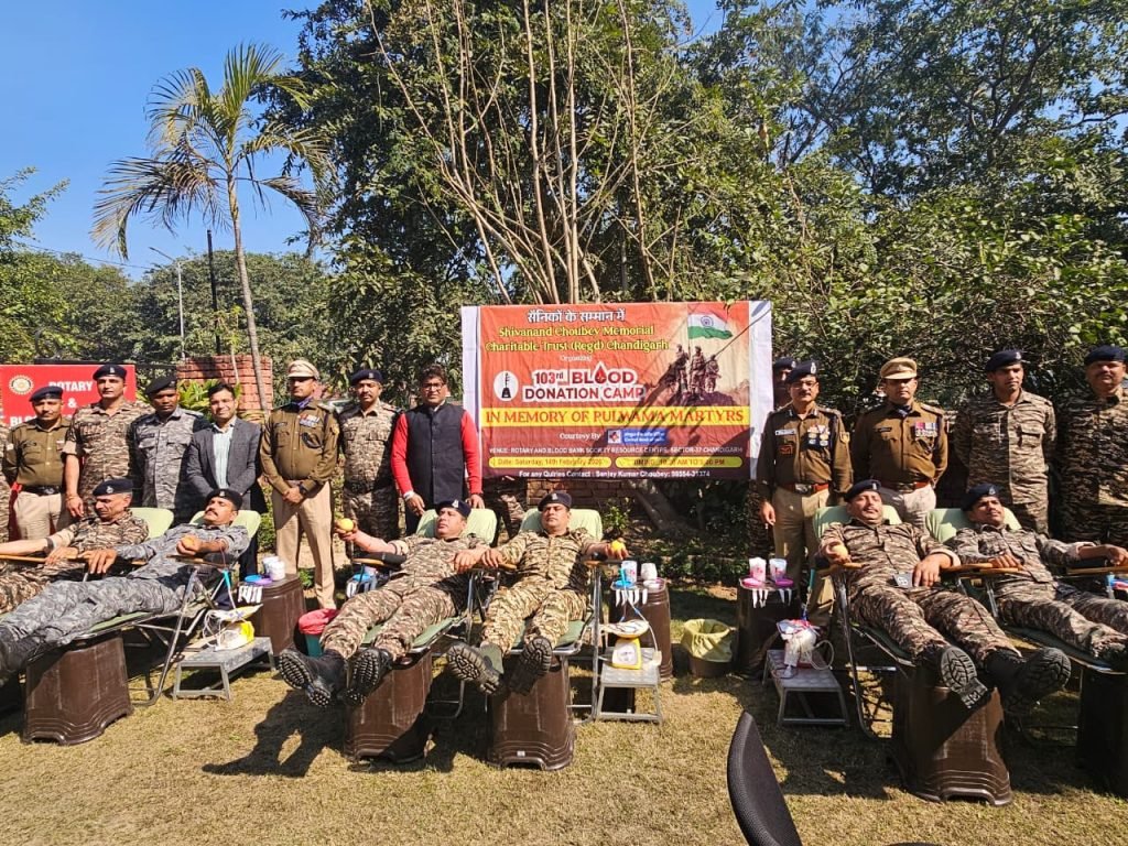 चंडीगढ़: पुलवामा आतंकी हमले में शहीद हुए जवानों की स्मृति में शिवानन्द चौबे मेमोरियल चैरिटेबल ट्रस्ट द्वारा 103वें रक्तदान शिविर का आयोजन किया गया। यह शिविर रोटरी एंड ब्लड बैंक सोसायटी रिसोर्स सेंटर, सेक्टर-37, चंडीगढ़ में संपन्न हुआ। मेडिकल टीम की देखरेख में शिविर के दौरान 82 यूनिट रक्त एकत्रित किया गया, जिससे जरूरतमंद मरीजों की जान बचाने में मदद मिलेगी।
