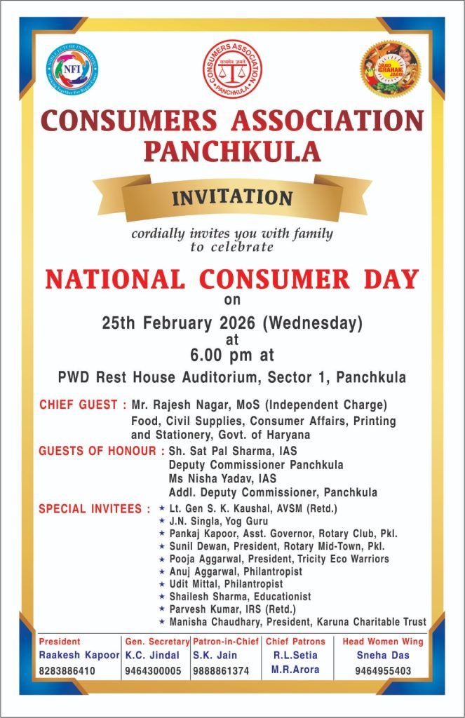पंचकूला, 22 फरवरी 2026। कंज्यूमर्स एसोसिएशन पंचकूला द्वारा 25 फरवरी (बुधवार) को राष्ट्रीय उपभोक्ता दिवस के उपलक्ष्य में भव्य समारोह का आयोजन किया जाएगा। कार्यक्रम शाम 6 बजे सेक्टर-1 स्थित पीडब्ल्यूडी रेस्ट हाउस ऑडिटोरियम में आयोजित होगा।