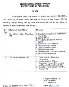 चंडीगढ़, 22 फरवरी 2026: Chandigarh Administration के कार्मिक विभाग ने आदेश जारी कर 21 फरवरी से 25 फरवरी 2026 तक दो वरिष्ठ आईएएस अधिकारियों के आधिकारिक दौरे के मद्देनज़र प्रशासनिक व्यवस्था में अस्थायी बदलाव किए हैं।