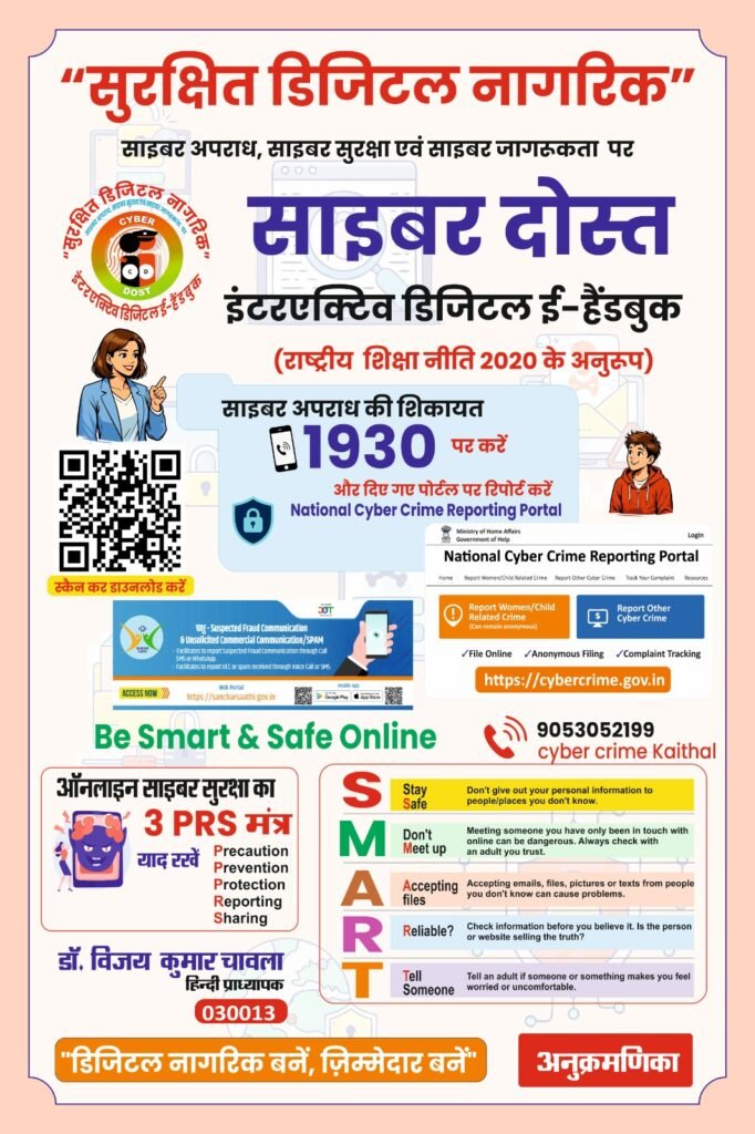 कैथल, हरियाणा: साइबर सुरक्षा के क्षेत्र में कैथल प्रशासन ने एक महत्वपूर्ण कदम उठाते हुए डॉ. विजय कुमार चावला द्वारा तैयार “साइबर दोस्त डिजिटल ई-हैंडबुक” को राष्ट्रीय सूचना विज्ञान केंद्र, कैथल की वेबसाइट पर अपलोड कर दिया है। यह पहल जिले में डिजिटल जागरूकता बढ़ाने और आम नागरिकों को साइबर अपराधों से सुरक्षित रखने की दिशा में एक बड़ी उपलब्धि मानी जा रही है।