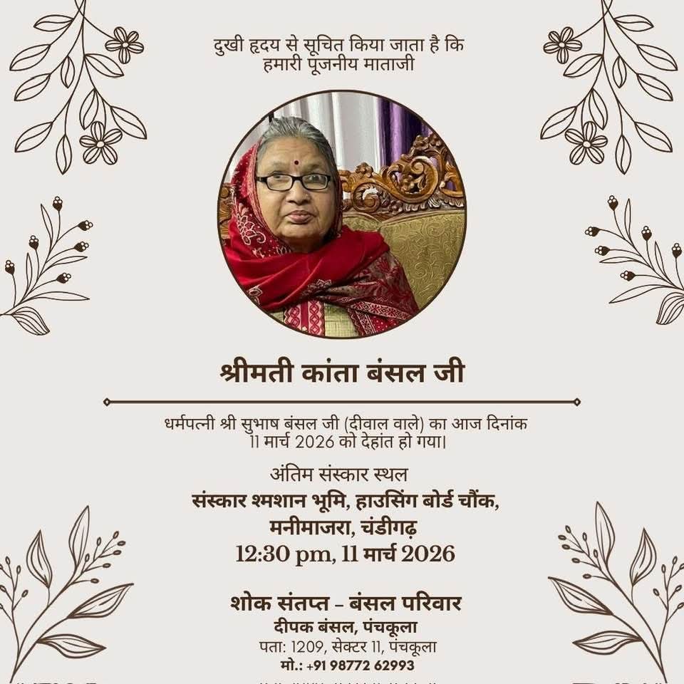प्राप्त जानकारी के अनुसार श्रीमती कांता बंसल, श्री सुभाष बंसल (दिवाल वाले) की धर्मपत्नी थीं। उनका देहांत आज 11 मार्च 2026 को हुआ।