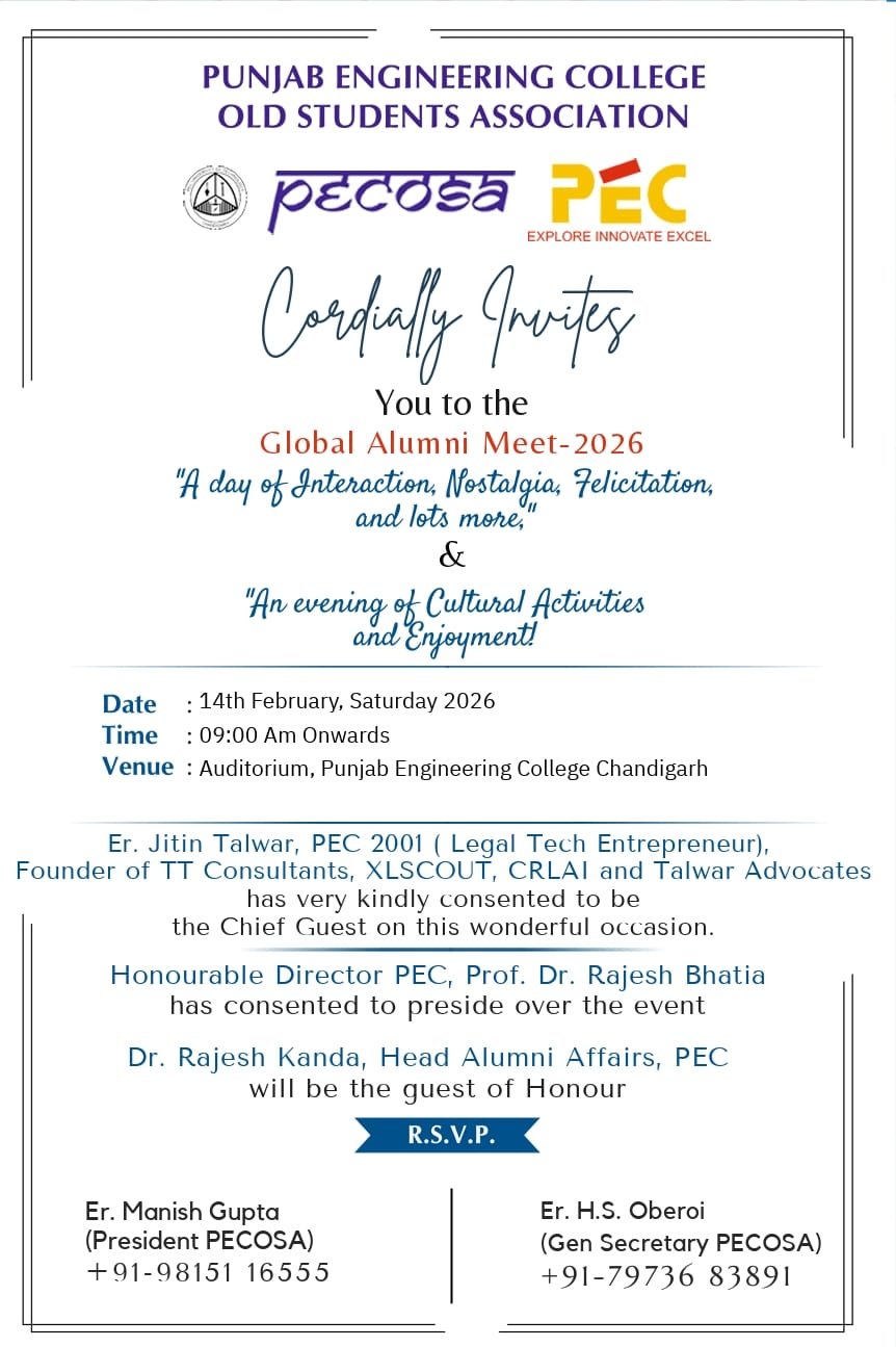 CHANDIGATH: 14 फरवरी को PEC में होगा ग्लोबल एनुअल एलुमनाई मीट 2026